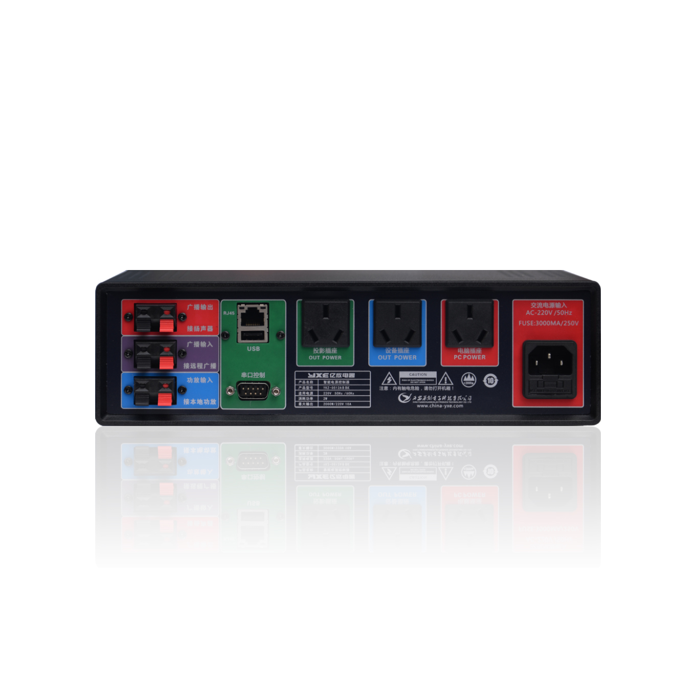 基于物聯(lián)網(wǎng)技術(shù),分布式智能控制終端; 2. 可對(duì)音視頻設(shè)備及電腦等設(shè)備進(jìn)行遠(yuǎn)程、本地控制及管理; 3. 具備遠(yuǎn)程物聯(lián)控制、智能化自動(dòng)控制及本地手動(dòng)控制三種種控制模式; 4. 可受控于云端服務(wù)器、多媒體電腦、音視頻工作站及錄播系統(tǒng)主機(jī)等核心設(shè)備; 5. 主機(jī)啟動(dòng)時(shí)接收開機(jī)指令,控制后端設(shè)備交流電源開啟; 6. 主機(jī)關(guān)閉時(shí)接收關(guān)機(jī)命令,關(guān)閉后端設(shè)備交流電源關(guān)閉; 7. Windows操作系統(tǒng)免驅(qū)動(dòng),即插即用; 8. 可外接各類常用傳感器、執(zhí)行器、控制器。 9. 具備防浪涌功能,避免浪涌對(duì)后端設(shè)備電源沖擊; 10. 自動(dòng)信號(hào)檢測(cè)功能實(shí)現(xiàn)教室內(nèi)多媒體擴(kuò)聲和校園廣播信號(hào)擴(kuò)聲,并且系統(tǒng)在兩者間能自動(dòng)切換; 11. 教室內(nèi)斷電或教室功放關(guān)閉時(shí)自動(dòng)切換至播出校園廣播信號(hào),確保聽力考試等重要用途不受影響; 12. 可自動(dòng)控制投影機(jī)交流電源,并對(duì)投影機(jī)執(zhí)行散熱后智能切斷交流電源,避免誤操作造成的燈泡損壞,延長投影機(jī)使用壽命; 13. 具備視頻切換功能,一鍵切換投影機(jī)視頻輸入; 14. 具備手動(dòng)控制功能,當(dāng)主機(jī)出現(xiàn)故障時(shí),后端設(shè)備仍可正常啟動(dòng)及關(guān)閉; 15. 具備遠(yuǎn)程控制功能,可在校園廣播中作為緊急廣播遠(yuǎn)程控制功放電源; 16. 手動(dòng)及自動(dòng)控制面板LED指示燈,方便查看工作狀態(tài); 17. 內(nèi)置程序編輯接口,可按客戶需要進(jìn)行程序開發(fā),滿足客戶定制功能需要; 18. 控制電流220V/10A,可控制高功率設(shè)備; |